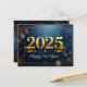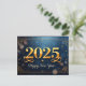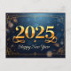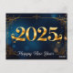 Celebre la llegada del 2025 con estilo y lujo. Este diseño de postal presenta una impresionante mezcla de azul profundo, acentos dorados y chispas suaves, creando un ambiente festivo y refinado. El audaz y elegante "2025" ocupa el centro del escenario, rodeado de delicados listones dorados y plateados, con estampados estelares y diseños abstractos enmarcando los bordes. Los efectos de bokeh suaves y el gradiente suave de la oscuridad a la luz realzan el encanto moderno y a la vez intemporal. La frase 'Feliz Año Nuevo' está gratamente escrita en la parte inferior, agregando un toque de sofisticación. Esta postal es la manera perfecta de iniciar el nuevo año con elegancia y clase
