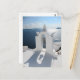 Un campanario de una iglesia blanca en Oia, Santorini, proyecta una sombra.