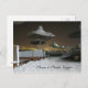 Una hermosa foto nocturna de sombrillas y tumbonas en la arena de Sharm el Sheikh en la península del Sinaí en Egipto. A lo lejos están las luces de la ciudad. En la parte inferior de la tarjeta está el texto "Sharm el Sheikh, Egipto" con una bonita letra. Personalizar si quieres.