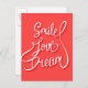 Tarjeta con elemento de diseño de tipografía dibujado a mano para posters de tarjetas de felicitación e impresión. Sonrisa amor sueño con pequeños nubarrones de corazones y sonrisa en el fondo rojo eps 10 | Bigstock® - Todos los derechos reservados.