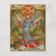 Esta mujer está lista para una fiesta de Halloween. Esta impresión vintage de Halloween representa a una mujer con una linterna de jack o'. Un murciélago y una vela están en primer plano.