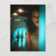 Una mujer con un vestido de oro aspira desde una puerta azul turquesa. Ella tiene una mirada sorprendida en su cara.