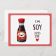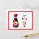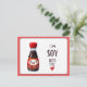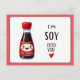 Una postal linda y juguetona con una botella sonriente de salsa de soja con el juego de palabras "Soy soya en ti". Perfecto para enviar un mensaje dulce y peculiar a alguien especial.