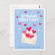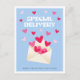 Valentine's day greeting card with cute envelope and hearts illustration, and modern script lettering "Special delivery". Pastel blue and pink colors.