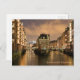 en esta postal se muestra una foto nocturna del Speicherstadt en Hamburgo. El tamaño de la tarjeta es de 13,9 cm x 10,6 cm y está impresa en una tarjeta ultrapesada de 325 gsm con acabado brillante.