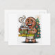 A joyful, cartoon-style Gingerbread Man, depicted with a wide, enthusiastic smile and rosy cheeks. He's wearing a simple white apron and heartily holding up a clear mug filled with dark, steaming coffee, with a prominent plume of steam curling upwards. The text "Spicy and Caffeinated" is creatively integrated onto the coffee mug in a bold, vibrant, multi-colored font, featuring subtle star and flake embellishments. In the background, a minimalist yet festive green Christmas tree is adorned with red and gold baubles, topped with a star, and radiating faint yellow light rays. The overall style is clean, cheerful, and graphically strong, with clear outlines.