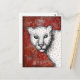 Spoted Leopard Says Hey presenta un leopardo blanco con manchas de taupe y ojos verdes sobre un fondo rojo texturado.