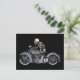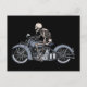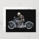 Motociclista de esqueleto sobre una bicicleta personalizado de época que pasa y ondea una señal de paz baja. Dibujo de tinta coloreado impreso en camisetas, carteras, tarjetas, regalos.