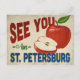 Una encantadora postal de viaje vintage de San Petersburgo en Florida con una hermosa manzana roja, junto con un divertido texto de estilo retro que dice, "Nos vemos en San Petersburgo"
