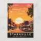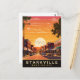 Postal de Starkville. Atardecer sobre la ciudad de Misisipi. Centro de Starkville. Postal de viaje ilustrada en colores vivos.
