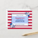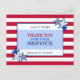 El diseño audaz y patriótico en la parte delantera de esta tarjeta postal de agradecimiento a usted presenta estrellas azules y blancas en patrones contrastantes contra un fondo de rayas rojas en blanco, en los colores de la bandera estadounidense. En la zona blanca de borde azul central, en un fondo azul claro están las palabras "Gracias por tu servicio" en la tipografía popular de tres colores diferentes. Encima y debajo de estas palabras están las palabras "Tierra de los libres por los valientes". Esta tarjeta es una excelente manera de expresar su agradecimiento a los veteranos en el Día de los Veteranos o en cualquier momento.