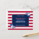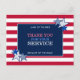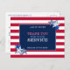 El diseño audaz y patriótico en la parte delantera de esta tarjeta postal de agradecimiento a usted tiene estrellas azules y blancas en patrones contrastantes contra un fondo de rayas rojas en blanco, en los colores de la bandera estadounidense. En el centro del área azul de borde blanco están las palabras "Gracias por tu servicio" en la popular tipografía vintage moderna de tres colores diferentes. Encima y debajo de estas palabras están las palabras, "Tierra de los libres por los valientes". Esta tarjeta es una excelente manera de expresar su agradecimiento a los veteranos en el Día de los Veteranos o en cualquier momento.