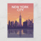 Striking flat graphic illustration of the Statue of Liberty (EST 1886) on a bold, warm yellow background with long shadows. Retro New York travel poster style.