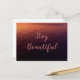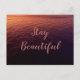 Hermosa postal motivacional con la palabra "Stay Beautiful" en letra simple y fondo de fotografía de agua del océano al atardecer.
