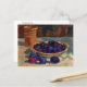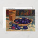 Una postal de arte fino con la pintura de Theo van Rysselberghe (1862-1926), Still Life with Plums (1926). Un pintor neo-impresionista belga. Un tazón lleno de ciruelas violetas sobre una mesa.