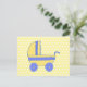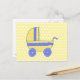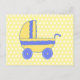 Ilustracion de un coche de bebé de amarillo y azul, sobre un fondo de polka dot con fondo blanco y amarillo.