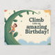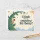 Una ilustración digital caprichosa y encantadora diseñada como saludo de cumpleaños. Representa a un joven feliz en una camisa a rayas y pantalones cortos, subiendo con entusiasmo una enorme y curva caña de frijol que se extiende hacia un cielo lleno de nubes suaves y pictóricas en tonos cálidos crema, naranja y azul. Las estrellas dispersas añaden a la atmósfera mágica, y el texto juguetón dice: "¡Sube a un cumpleaños increíble!"