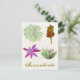 This postcard features my original coloured pencil art work of four succulents in vibrant colours. The postcard background is cream coloured.
