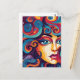 Un retrato colorido muestra una representación abstracta de la cara de una mujer rodeada de patrones giratorios en tonos azules, rojos y naranjas. Sus ojos son grandes con azotes prominentes, y los rizos y formas estilizados le dan a la composición una atmósfera de ensueño.
