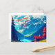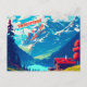 El Swiss Retro Alpine Chalet Travel Postcard cuenta con un chalé alpino situado en los alpes suizos con vistas a un lago de tipografía roja. ©2024 Victorious2 www.zazzle.com/store/Victorious2