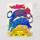 Dos pequeños gatos de tabby en el tubby saltan sobre el sol en una hermosa danza del solsticio con un pájaro volando sobre el cielo.