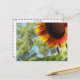 Esta llamativa postal cuenta con una fotografía de primer plano de un girasol brillante sobre un fondo de enfoque suave. Los vívidos pétalos amarillos del girasol pasan a un rico naranja en las puntas, rodeando el centro marrón oscuro lleno de semillas. El fondo de un cielo azul claro y un follaje verde borroso resalta la belleza de la flor, haciendo que esta postal sea perfecta para cualquier ocasión que requiera un toque de esplendor de la naturaleza.