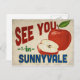 Una encantadora postal de viaje vintage de Sunnyvale California con una hermosa manzana roja, junto con un divertido texto de estilo retro que dice, "Nos vemos en Sunnyvale"