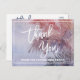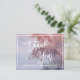 Esta postal es perfecta para una boda en la playa o destino de destino. El diseño se caracteriza por una impresionante puesta de sol de color rosa, violeta y azul con una palmera soplando en la brisa. Personalice la parte delantera de la tarjeta con un mensaje corto. Personalice la parte posterior con un mensaje de agradecimiento más largo. Como alternativa, deje en blanco la sección plantilla de mensajes de agradecimiento para escribir a mano una nota personalizada en cada postal después de su llegada. Estas postales se pueden usar para la ducha de novia, el boda o cualquier evento especial.
