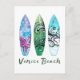 El trío de elegantes tablas de surf con decoración artística es un diseño perfecto para la mundialmente famosa Venice Beach, California, conocida por su surf, su ecléctico paseo marítimo y su escena de voleibol.