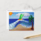 (La pintura es de un ángel verde sobre una tabla de surf naranja que captura una ola. Un sol brilla al fondo y la palmera se desliza suavemente en la playa. La ola se está preparando para estrellarse en la playa suavizando la superficie arenosa. El ángel verde rinde homenaje al Arcángel Rafael, cuyo color es verde y es conocido por traer curación. El sol ayuda a mantener la vida y a través de ella plantas como las palmeras se fortalecen y crecen. El poder de la energía solar se simboliza en la tabla de surf naranja-amarilla. La playa está limpia y es tranquila. Esta pintura se inspiró en el "Ángel de la eliminación del cáncer". En lugar de agregar texto de esta pintura, se dejó abierto para que puedas tu propia borradura, subiendo la ola, u otro tipo de mensaje de flujo a la playa, nube o cielo.