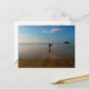Esta postal contiene una fotografía de una playa de Cornish. Un surfista observa las olas en la bonita playa de Perranporth en Cornwall. Fotografía de Poldark Country