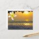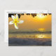 Envíe saludos desde Hawái con esta postal de imágenes de surfistas disfrutando de las olas al atardecer. La puesta de sol arroja una reflexión dorada a través del Océano Pacífico. El saludo a través de la plumería blanca y amarilla dice Aloha de Hawai`i