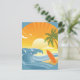 Diseño redondo de una escena playera con una pequeña isla con palmeras y una tabla de surf en la arena, rodeada de olas azules bajo el sol. Esta postal es totalmente personalizable.