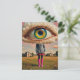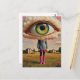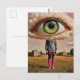 A surreal woman in a grey sweater and pink boots with her head in the clouds and a giant eyeball