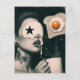 AI generated fantasy art of a woman with toast and egg mask on her face holding her coffee