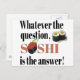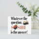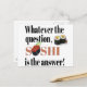 El texto dice "Cualquiera que sea la pregunta, SUSHI es la respuesta". La palabra SUSHI está rodeada de dos imágenes de sushi. ¡ Perfecto para los amantes del sushi!