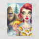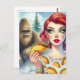 Una mujer con una camiseta de taco sostiene un taco en el bosque mientras Sasquatch observa el arte generado por su IA