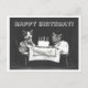 Esta postal es una reproducción de una vieja fotografía en blanco y negro que muestra a dos gatos vestidos con ropa sentados en una mesa con una tarta de cumpleaños.