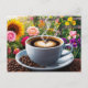 Postal Taza de café de la mañana y hermoso jardín floral