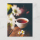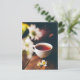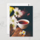 Taza de té negro y dos flores de camomila sobre superficie de madera. Buquet borroso en primer plano