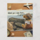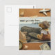 Esta tarjeta postal captura un tierno momento de tranquilo deambular: un pequeño osito de peluche posado junto al agua, mirando hacia los barcos lejanos bajo un cielo suave y nublado. Rodeada de recuerdos de viaje clavados en un corcho, la escena lleva un suave sentimiento de nostalgia y afecto. Una forma sincera de decir que eres muy querido, sin importar a dónde te lleve el viaje.
