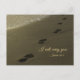 Esta postal contiene un solo juego de huellas en la arena de la playa con una cita de las Escrituras Bíblicas, Isaías 46:4, yo te llevaré.