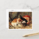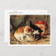 Postal de arte fino con la pintura, Tea Time (1905) Henriëtte Ronner-Knip (1821-1909), pintora holandés-belga del movimiento Romanticismo, famosa por sus representaciones de perros y gatos. La obra representa una adorable escena de gatitos bebiendo de una taza de té con una tetera de porcelana roja al fondo.