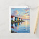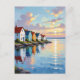 Manténgase en contacto con sus amigos de la familia con esta hermosa postal con un ilustracion aéreo de una hilera de cabañas en la costa de una bahía o entrada del océano al atardecer.