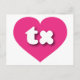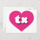 Esta postal tiene un vibrante corazón rosado caliente que contiene las letras fundas tx, negrita, blanca, redondeada y baja, una abreviatura juguetona para Texas, el estado de la estrella solitaria. El reverso de la postal está en blanco, esperando el texto personalizado o los sentimientos escritos a mano.
