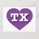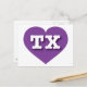 Esta postal tiene un vibrante corazón púrpura que contiene las letras atrevidas, blancas y fundas superiores TX, la abreviatura oficial de Texas, el estado de la estrella solitaria. El reverso de la postal está en blanco, esperando el texto personalizado o los sentimientos escritos a mano.