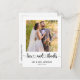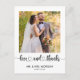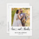 Moderna y sencilla tarjeta postal de boda gracias a la plantilla con texto de caligrafía de moda. La plantilla incluye una fotografía de boda cuadrado. La foto y el texto se pueden personalizar fácilmente para un diseño único de un buen boda para su día especial.