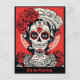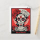 La tarjeta postal presenta un llamativo fondo negro que prepara el escenario para la vibrante y llamativa obra de arte en su centro. En primer plano, una vívida representación de La Calavera Catrina en estilo pop art rojo y blanco toma el centro del escenario. La icónica figura del cráneo está adornada con detalles intrincados, y el contraste de tonos rojos y blancos crea un impacto visual fascinante. El uso de líneas audaces y características exageradas rinde homenaje al estilo pop art, infundiendo un giro contemporáneo en el motivo tradicional del Día de Muertos. La cara del cráneo está adornada con delicados giros, patrones intrincados y florituras cautivadoras, que reflejan el espíritu festivo y artístico de la celebración.