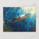 Una obra de arte pintada digitalmente que muestra a un tiburón nadando con gracia en medio de un colorido arrecife submarino lleno de medusas.