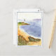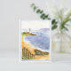 Esta divertida acuarela es de una escena playera con su barco de fila y su faro al fondo con veleros navegando por el mar azul.